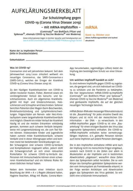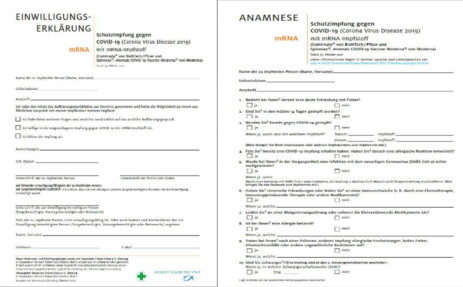 Hier auf der Seite des RKI können Sie das Formblatt "Anamnese und Einwilligung" (PDF) herunterladen. Und hier gibt es auch das Formular "Aufklärungsmerkblatt" (PDF). Bedes dann bitte ausgefüllt zur Impfung mitbringen.Bei Folgeimpfungen fällt das "Aufklärungsmerkblatt" weg.
