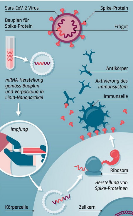 mRNA überträgt die genetischen Informationen der DNA für den Aufbau von Proteinen (Eiweißen = Aminosäurenketten) in der Zelle. Sie sind der Bauplan für diese Proteine. So kann aus den in der Zelle vorrätigen Aminosäuren Stück um Stück ein neues Protein zusammengesetzt werden. Die mRNA wird in der Zelle gebildet, kann aber auch von außen zugeführt werden. Der Körper bemerkt erst mal keinen UnterschiedFrühere Impfstoffe waren nichts anderes als abgeschwächte oder abgetötete Viren der Krankheit, gegen die geimpft wurden (als abgeschwächte Masernviren gegen das Masernvirus). Diese Viren können keine Infektion mehr ausrichten, der Körper erkennt sie aber sehr wohl als fremd und bildet Antikörper dagegen.Ein mRNA-Impfstoff besteht aus mRNA-Anteilen des Virus, gegen das geimpft wird. Genauer: es ist der Bauplan gegen das Spike-Protein, mit dem sich das Virus an den menschlichen Zellen festklammert. Die Zelle MUSS nach der Corona-Impfung diesen Bauplan ausführen und bildet – ein Virusprotein, das Spike-Protein. Folge: Dies Proteine sind jetzt im Körper, aber ohne das restliche Virus. Bald erkennt der Körper an der Struktur dieses Proteins, daß es fremd ist, der Bauplan wurde ihm also offensichtlich „untergeschoben“. Und jetzt bildet er auch Antikörper gegen das Protein, daß dadurch rasch zerstört wird.Wenn jetzt ein echtes Virus kommt, erkennt der Körper es an seinem Spike-Protein und neutralisiert es. Das Virus kann sich jetzt nicht mehr an die Zellen andocken, sondern schlingert ziellos in den Körpersäften umher. Siehe auch das Bild rechts. Ein Klick aufs Bild führt zu einem verständlichen Text und auch zu einem Video.(Bild: Anne Seeger, SCNAT (CC BY 4.0)Voraussichtlich hält dieser Impfschutz aber nicht sehr lange, da Mutationen des Bauplans für das spike-Protein laufend neu entstehen, Stichwort Delta-Variante.Je weiter entwickelt eine Mutation ist, um so weniger kann die zurückliegende Impfung bewirken. Und braucht also erneut eine Impfung. Näheres wird sich aber zeigen und bei den regelmäßigen Nachrichten auch zeitnah verkündet werden.