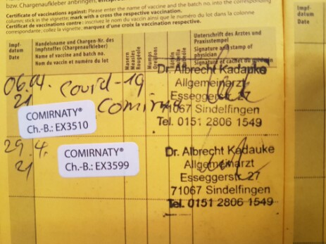 Leider ist es schon passiert, daß bei großem Betrieb einmal ein Stempel oder eine Unterschrift vergessen wurde, deshalb:Wenn Sie Ihren Impfpaß erhalten, dann prüfen Sie bitte gleich, ob alles Notwendige drinsteht:Datum, Impfstoffname und Chargen-Nummer, Stempel, Unterschrift -- s. auch Bild nebenan.